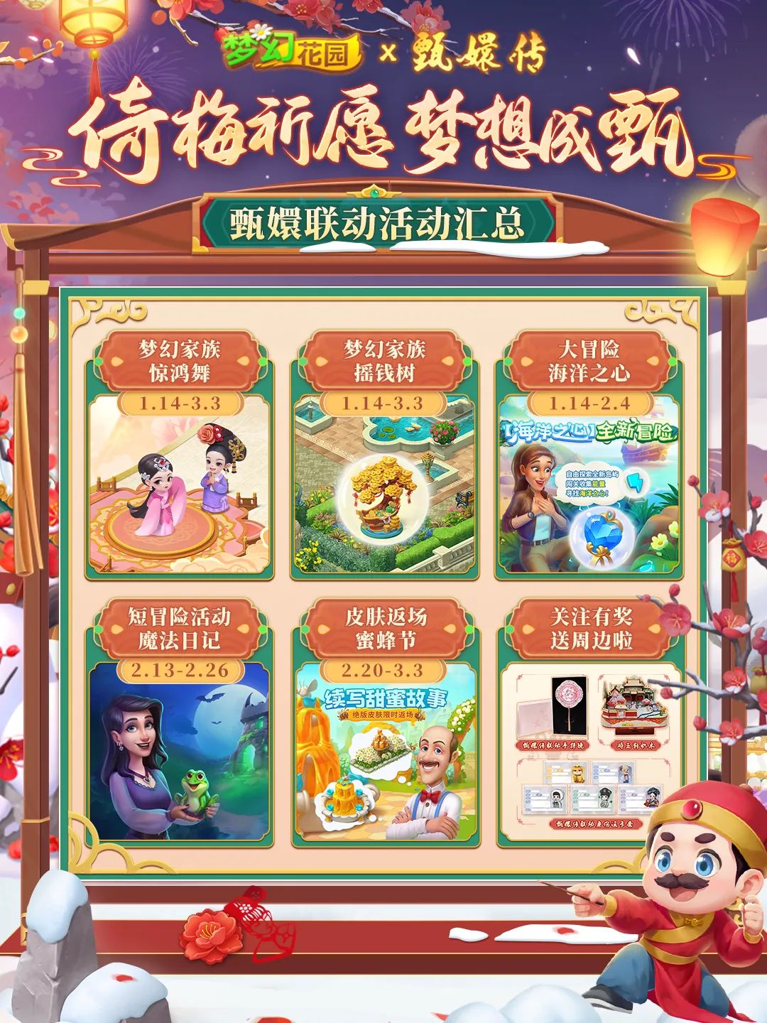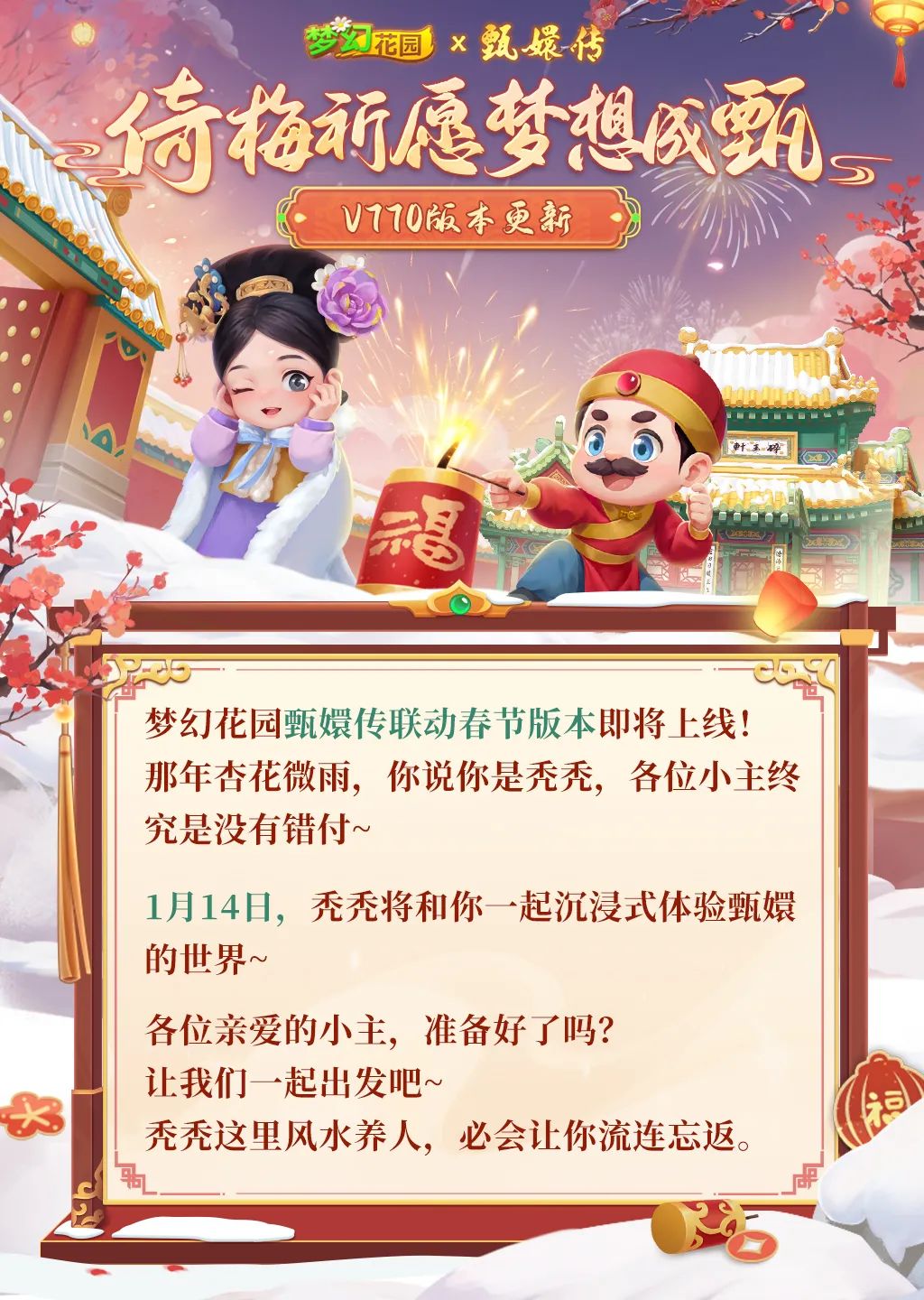 禿禿的福氣來啦,和大家心心念念的《甄嬛傳》聯(lián)動上了,從1月14日至3月3日,玩家們將沉浸在一個融合了經典劇情與現(xiàn)代游戲樂趣的世界中,體驗前所未有的夢幻花園?!皨謰忠谎U”新皮膚,“紅梅春信”收集新道具,“大橘四郎”和“三花宛宛”全新寵物,甄嬛PK賽—尋詩芳錄……眾多精彩和福利等待玩家解鎖,新的一年,大家一起倚梅祈愿,夢想成甄!快來看看禿禿與嬛嬛將碰撞出什么樣的火花吧!